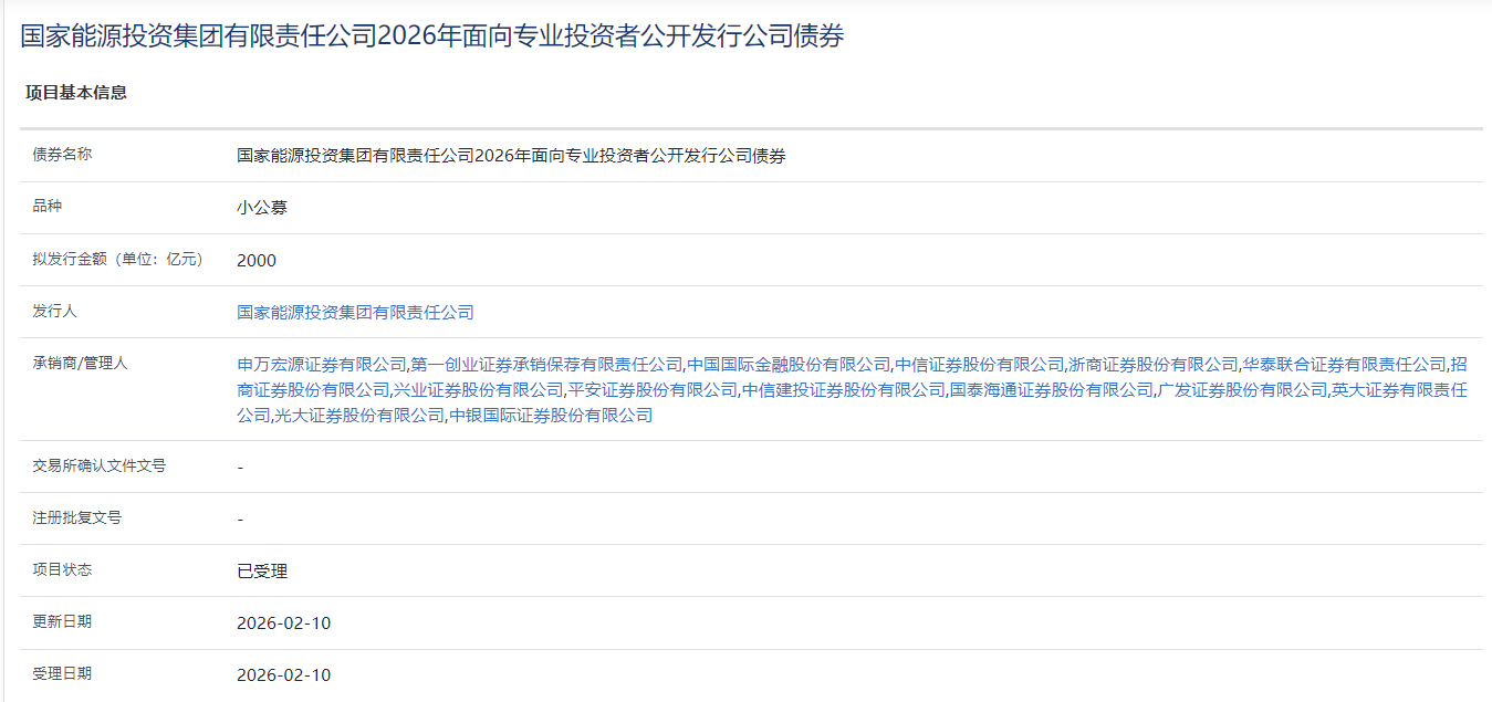 【大河财立方消息】2月10日,国家能源投资集团2000亿元小公募获上交所受理。